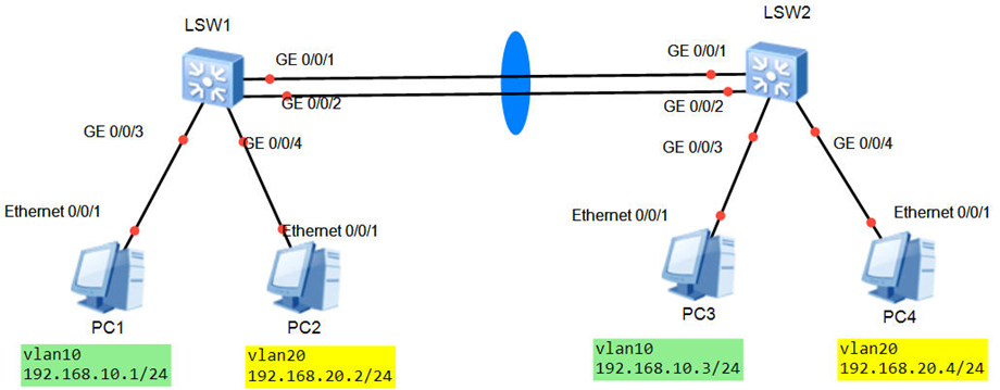 eth-trunk可以把多个独立的物理接口绑定在一起,作为一个大带宽的逻辑接口使用